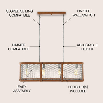 Perfectly sized for over a kitchen island, kitchen table or cottage dining room, this linear pendant combines wood finishes and chicken wire for rustic country chic. The metal frame features four Edison-style LED bulbs for a vintage touch. This versatile linear pendant is ideal for modern farmhouse dining rooms as well as rustic, industrial spaces.