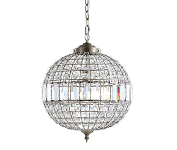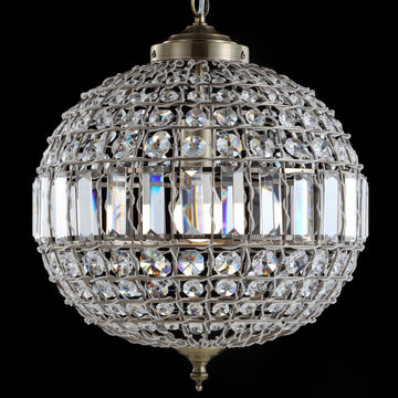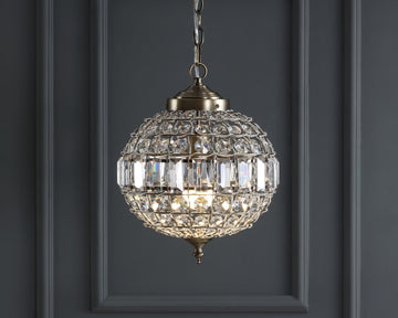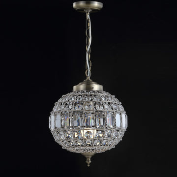 Classic elegance exudes from this finely designed and crafted crystal pendant. With a classic globe shape and antique brass fittings, the addition of faceted crystals into all the open spaces creates a glamorous effect. With one bulb concealed within its sphere and a fully adjustable chain length, this fixture could be equally at home in spaces big and small.