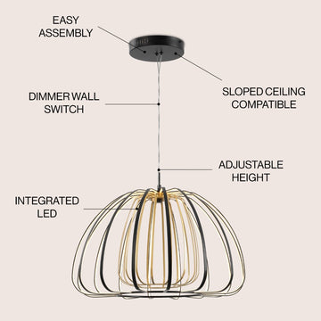 Perfectly sized for a kitchen, small dining room, or over a desk, this modern pendant features a striped cage lampshade frame. Integrated LEDs along the two-tone metal frame provide ambient, warm light. Use this versatile pendant to add a touch of glam to any room; add to the drama with an LED-compatible dimmer switch.