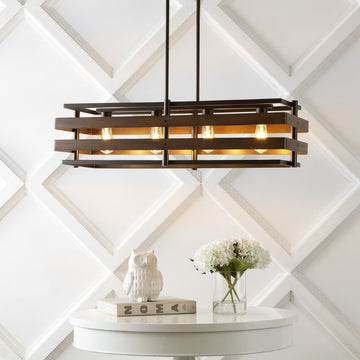 Inspired by the clean lines of mid-century design, this linear pendant light features a rich, wood finish on its horizontal slats, where four LED Edison bulbs shine through to provide warm, ambient light. The adjustable-height metal frame has an understated, minimalistic look.