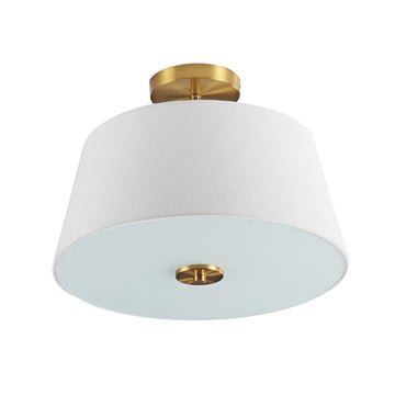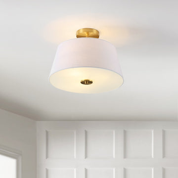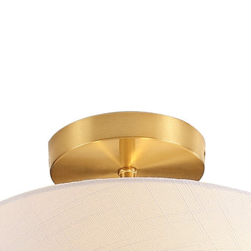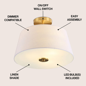 - This flush mount light has brass accents and an elegant linen shade for a minimalist, modern look