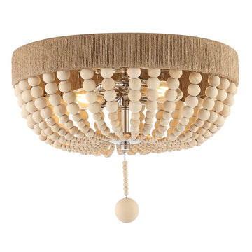 Our flush mount light fixture's unique design features a dome light shaded by strings of wooden beads that give it a rustic, coastal-Bohemian vibe. The versatile natural tones of wood and jute fit into almost any decor. Includes two LED bulbs for bright, sparkling light.
