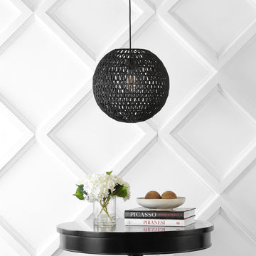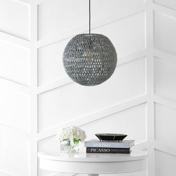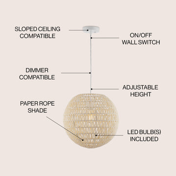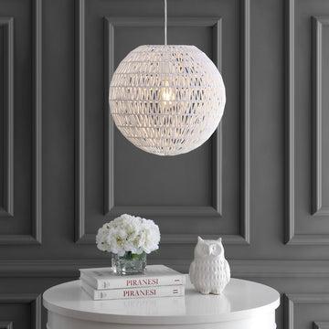 Modern design meets traditional craftsmanship in our white woven globe pendant. Made from paper wicker woven onto a sturdy metal frame, this ceiling fixture adds a Bohemian touch to your living room, bedroom, or dining room. Additionally, the drop is adjustable from 16" to 88", making it suitable for a ceiling of any height.