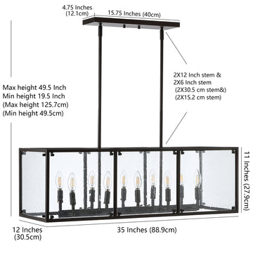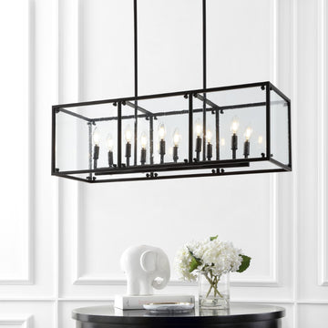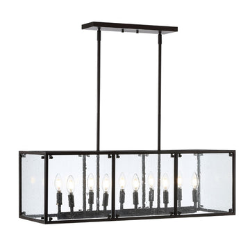 Perfectly sized for an oversized kitchen island, long kitchen table or dining room, this pendant lantern is linear and modern. The simple black metal frame features ten Edison-style LED bulbs for an industrial touch. This versatile linear pendant is ideal for modern, minimalist dining rooms as well as rustic farmhouse spaces.