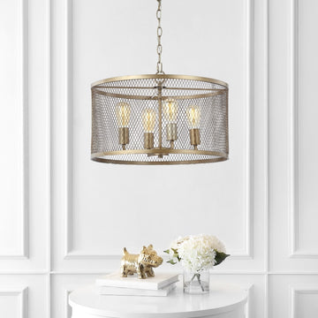 Industrial style gets a touch of glamor with the gold finish on our modern drum pendant. Four Edison-style LED bulbs illuminate a diamond-pattern metal mesh drum shade. This versatile light fixture is perfectly sized for a dining room, kitchen, bedroom or entry.