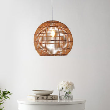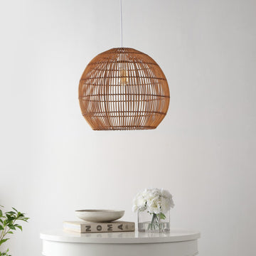 Modern design meets traditional craftsmanship in our woven globe pendant. A single LED bulb provides bright, warm light. Made from natural rattan woven onto a sturdy metal frame, this ceiling fixture adds a Bohemian touch to your living room, bedroom, or dining room. Plug in or hardwire.