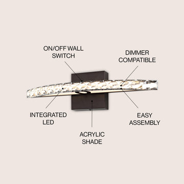 Crystal prisms form a line of jewels to create a glamorous vanity light with vintage flair. The sleek metal finish accentuates the clean lines, and acrylic prisms add sparkle and texture to the minimalist design. Add a touch of glam above a bathroom mirror, or use these Art-Deco-inspired sconces in a hallway or bedroom.