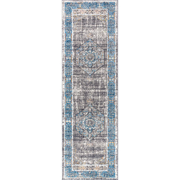 Based on a vintage medallion rug design, Anatolia mixes peacock blue and shades of gray for a modern color palette. A central medallion in peacock blue sits on a mingled gray background. An ornate border in peacock blue accented with mustard yellow completes the design. Varying shades of color create a worn, vintage look.