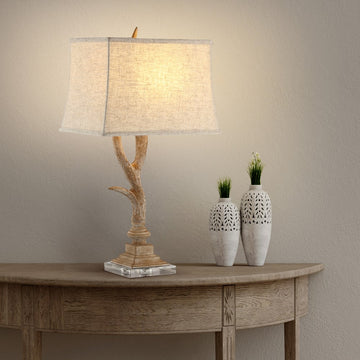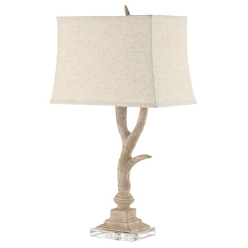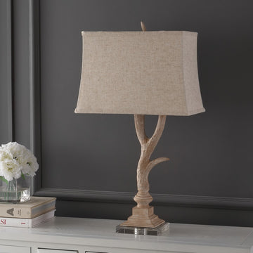 Infuse your home with the warm, rustic feel of the natural outdoors. Designed with a faux antler base, this cabin-inspired table lamp is topped with a natural gray linen drum shade. A crystal pedestal adds an unexpected elegant touch.