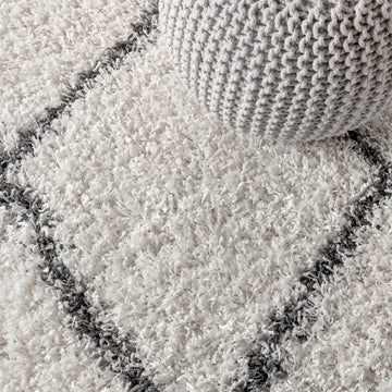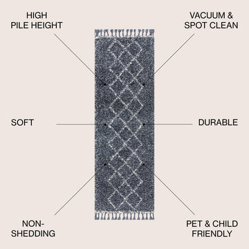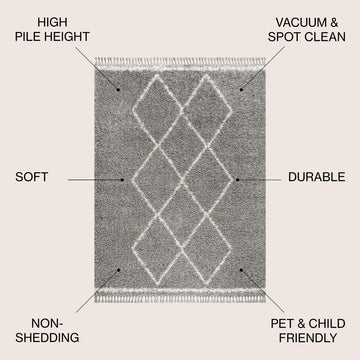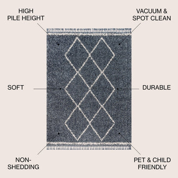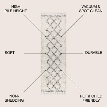 A clean, linear update to the classic Moroccan diamond trellis design is simultaneously simple and stunning in this plush 2" pile rug. Power loomed, it has durability that will withstand light traffic and an occasional cleaning while retaining style inspired straight from the souk. Made from polypropylene, this synthetic fiber is not only super soft, but solution dyed for lasting color.