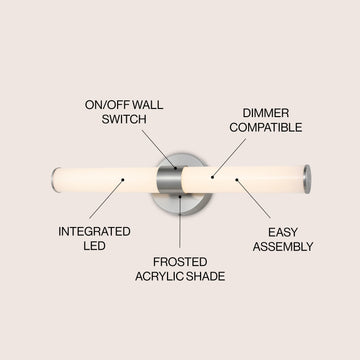 Add low-key sophistication to your modern bath vanity with our mid-century-inspired contemporary wall light. The sleek metal finish accentuates the clean lines, and frosted acrylic cylinders add unexpected texture to the minimalist design. This versatile light is a chic addition to contemporary, transitional or mid-century modern spaces.