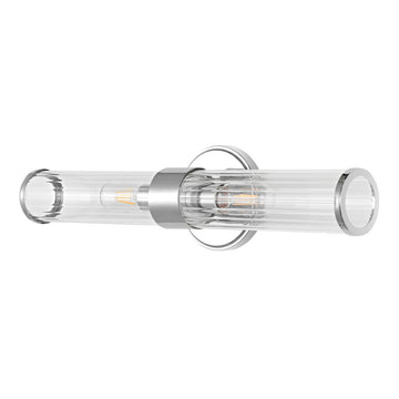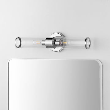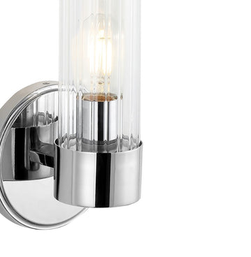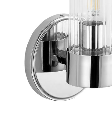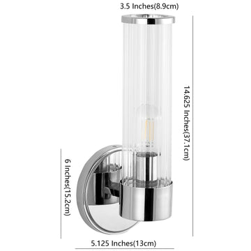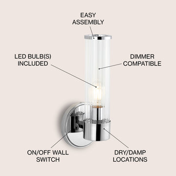 Add vintage glamour to your master bath with our classic mid-century style chrome wall light. A single Edison-style LED bulb in a clear glass cylinder provides plenty of light. Make a statement with two of these large sconce lights flanking a mirror, or use them to light a hallway. Clean lines and a sparkling chrome finish add modern Art Deco style to your bath vanity, hallway or entry.