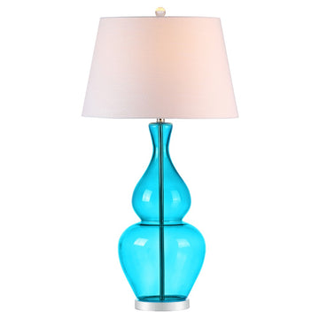 The refined double gourd shape of this large table lamp, combined with a classic linen drum shade, create a compelling blend of traditional and contemporary design that is well-suited to a variety of design styles. Accented with a base gleaming in hand-applied chrome and fittings and a finial to match, the clean lines of this light fixture will add a fashionable and functional touch to any home. In addition to enhancing your space with its chic design and eye-catching color, you can rely on this lamp to last -- it's chrome hardware and UL-rated electrical components make it built to illuminate memories for years to come.