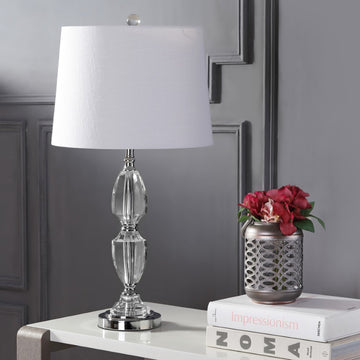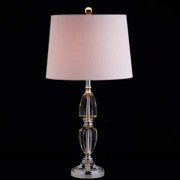 Make room for traditional elegance, as a column of crystal stacks up and sparkles from every angle. The square crystal base of our lamp continues the aesthetic while a slightly tapered linen shade enhances the light's reflection. Topped with a crystal finish and finished with a silk-wrapped 60" cord, this lamp will add traditional glamour to any home.