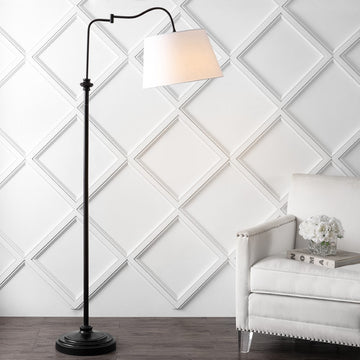 A classic design for living room or library, this stylish floor lamp features a swing arm and adjustable height to direct light exactly where it's needed. Standing tall at 68", this elegant lamp is topped with a linen shade to suit traditional and modern interiors. Finished in a rich oil-rubbed bronze.