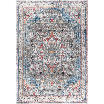 A classic medallion rug design, Maras stands out with its unusual gray color scheme. A central medallion on a mingled ivory and gray background is accented with faded red and turquoise. Varying shades of charcoal and gray create a worn, vintage look.