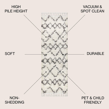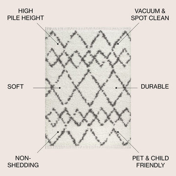With a nearly 2" pile of super soft polypropylene, this plush rug is made for comfort but high on style. In a classic Moroccan pattern of zigzag lines that overlap to create stripes of diamonds, the oversized scale of the design creates an optical illusion to make your space similarly feel larger. While high pile rugs such as shags and Moroccans are generally best used in low traffic areas to avoid becoming matted down, with regular cleaning and rotation so that it wears evenly, this rug would be lovely in a living space.