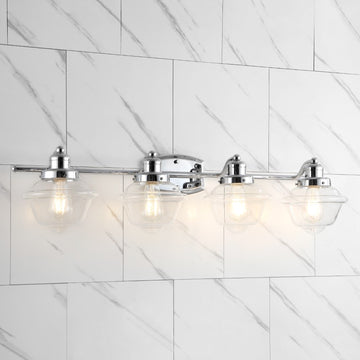 Bring on the mid-century flair with our sparkling chrome wall light. A single/two/three/ or four Edison-style LED bulb casts a warm glow. The schoolhouse style clear glass globe adds vintage style to your bath vanity, kitchen, hallway or entry.