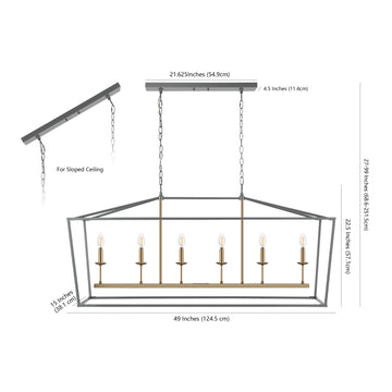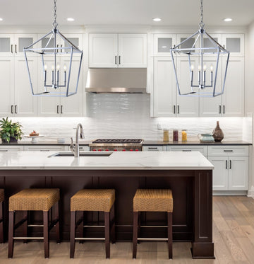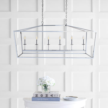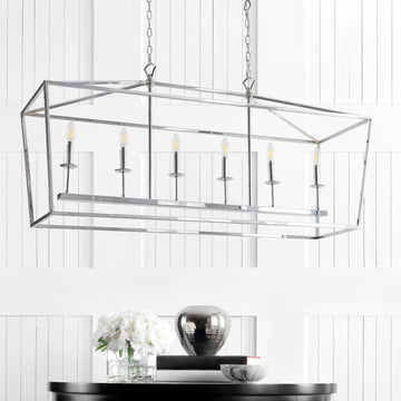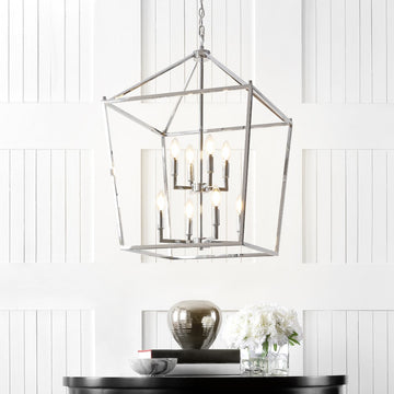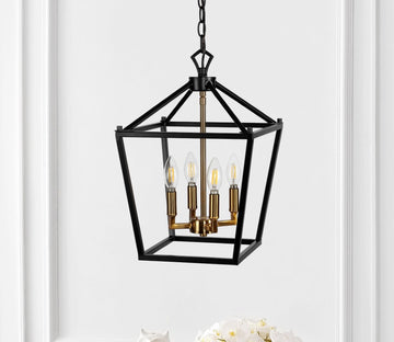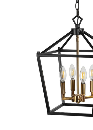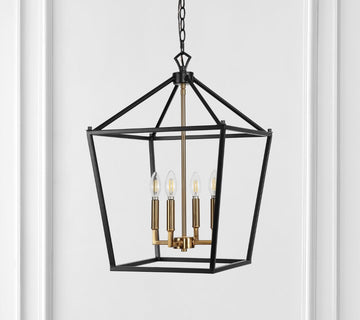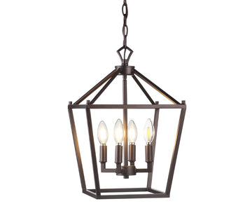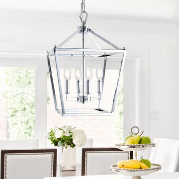 This classic lantern pendant light features a metal caged frame of negative space with exposed bulbs that illuminate from within the center. The shape of the fixture is inspired by iconic street oil lanterns. The pendant light suspends from a chain link that is adjustable to allow the fixture to hang only 22"down, or up to 94" from your ceiling, where it anchors with a round metal canopy.