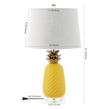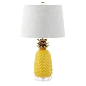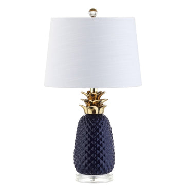The universal symbol of hospitality, this ceramic pineapple in navy, perched upon an acrylic base, adds whimsical character to any space. Try it in a guest room to make any visitor feel welcome in the space, or in a kids room for a fun touch of tropical style. The acrylic base and matching finial add a contemporary touch to a fun modern style.