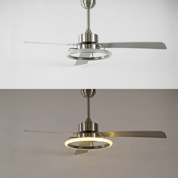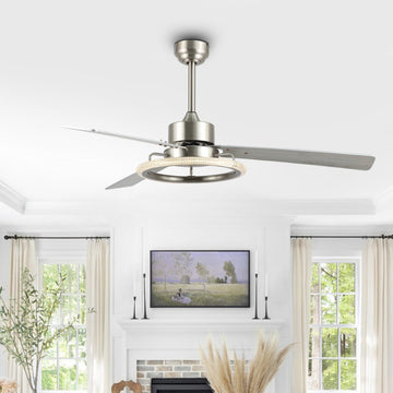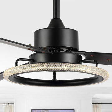 This contemporary 52" ceiling fan has a modern body style with three fan blades. The ring light features energy-saving integrated LED bulbs that last for years, covered in clear crystal accents. Six fan speeds and dimmable LEDs let you create the perfect setting for the living room, bedroom or office.