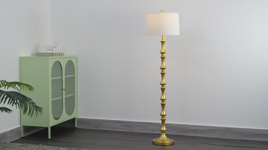 This striking gold floor lamp features a turned silhouette that looks stylish in a variety of home settings. Featuring a uniquely shaped gold metal neck and cotton drum shade, the smaller elements are equally well designed -- including a matching finial and silk-wrapped cord. At nearly 63" tall, it would be perfect for extra reading light beside a sofa or club chair.