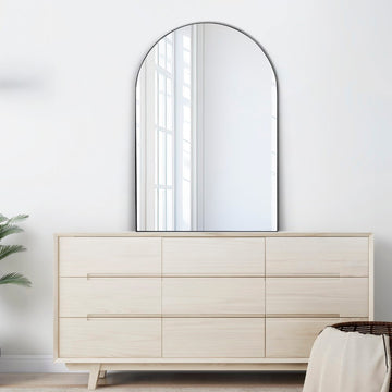 This sleek, modern mirror has a classic arched top that will add a vintage vibe to any space. The versatile wall-hung or leaning design is strengthened by a narrow metal frame. Its vertical orientation is ideal for a bathroom vanity, bedroom or entry area.