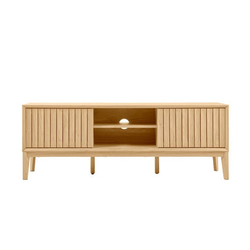- The matte euro oak shade of the TV console adds a modern touch to any space