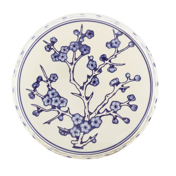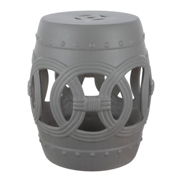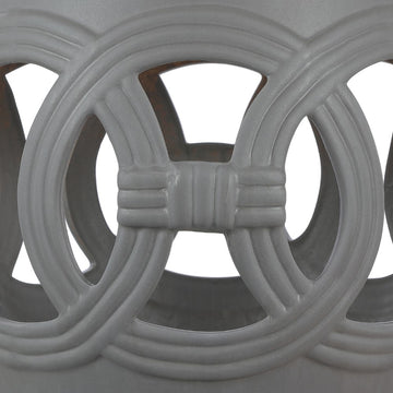 Our drum-shaped ceramic Chinese garden stool brings good fortune with a central band of lucky coin symbols. Chinoiserie garden seats are loved by traditional design fans, but our solid white glaze gives this stool a modern touch. Use it indoors or outside as a cocktail table, garden seat, or plant stand.