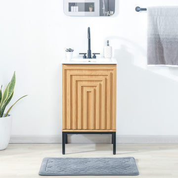 Give any bathroom a modern edge with this chic geometric vanity. Made from durable MDF with a wood-grain finish, the minimalist design features a soft-close door with a distinctive design of concentric squares on sleek metal legs. With an adjustable interior shelf, this vanity offers plenty of storage; sink is not included.