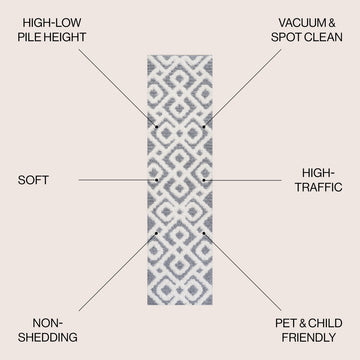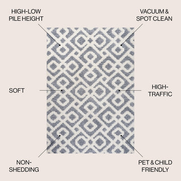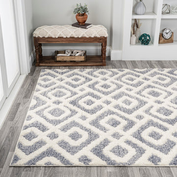 Mid-century style influences the bold pattern and texture of our modern diamond trellis rug. The timeless geometric design features flat-weave and fluffy yarns that add texture to the living room, bedroom or home office. This versatile, easy-care rug can fit in anywhere, from a modern, minimalist interior to a Boho loft or Scandinavian cottage.