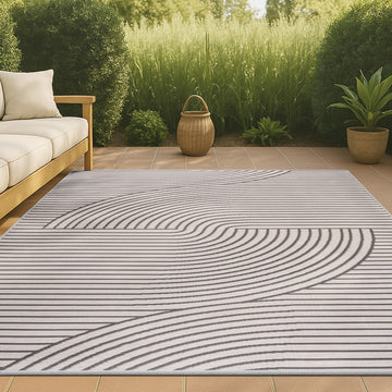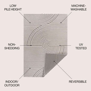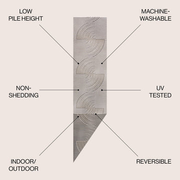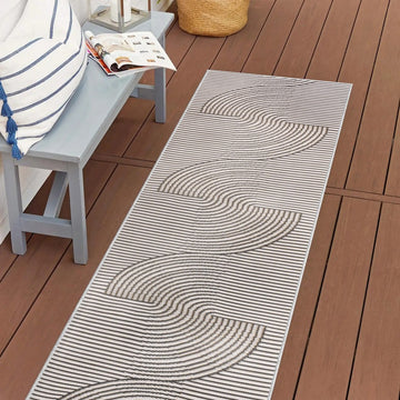 Our modern geometric rug is inspired by mid-century Scandinavian style. It's made from durable polypropylene fibers woven into a reversible curved stripe pattern. Use this stylish geometric rug outdoors, or in the bedroom, living room or dining room.