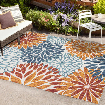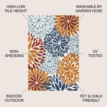 With its splashy, modern floral pattern in blue and orange, this indoor-outdoor rug has a fresh look that's ideal for a family room, dining room, bedroom, or kids' rooms. Soft, durable synthetic fibers are an easy maintenance solution for homes with kids and pets. Choose from several colorways and add a splash of style to your porch or patio.
