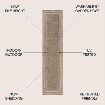 Our classic border rug has three wide stripes with a plain center field. It's woven from durable synthetic fibers in a two-tone design. Use this easy-care, family-friendly rug on the porch or deck, or in high traffic spaces like a living room, kids room or entry.