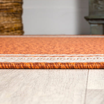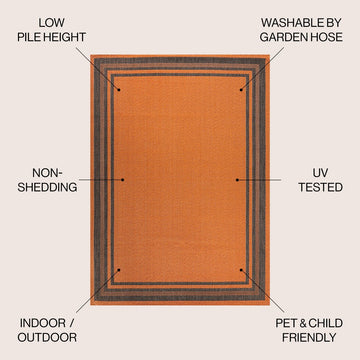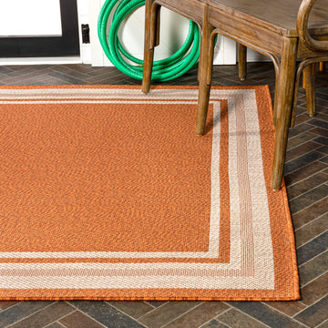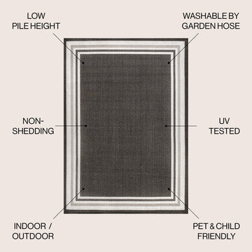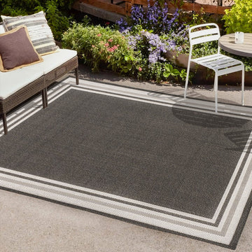 Inspired by the clean lines of modern design, our stripe border rug has a durable low pile. This versatile pattern is woven in contrasting colors for a low-key, minimalist look. Add graphic punch to your living room, dining room, bedroom, or porch with this easy-care, family-friendly rug.