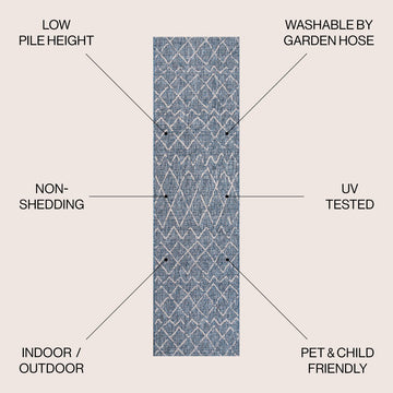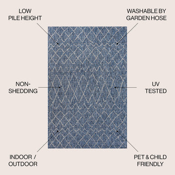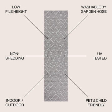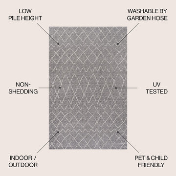 Inspired by vintage Moroccan rugs, our indoor/outdoor rug adds modern Bohemian style to your porch, patio or sunroom. The classic Moroccan pattern has a geometric design of beige diamonds on a field of dark gray. Mingled threads give this rug a handwoven, vintage vibe that's perfect for an entry, kitchen, hallway, living room or bedroom too. The pet-friendly and kid-proof flatweave design makes it easy to clean, and perfect for the beach house.