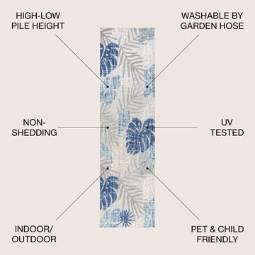 Whether you live in a beach retreat or just love jungalow style, the tropical leaf pattern of this rug brings the jungle home. Monstera leaves and palm fronds create an abstract pattern with a textured weave. The pet-friendly and kid-proof low-pile design makes it easy to clean.
