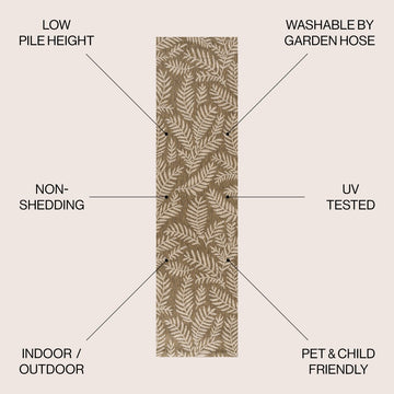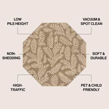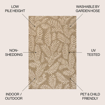Whether you live in a tropical beach retreat or just love jungalow style, the allover palm frond pattern of this rug brings the jungle home. Scattered palm tree branches create graphic contrast in rich brown and cream tones. The busy pattern is perfect for your tropical patio, entry, kitchen, hallway, living room or bedroom. The pet-friendly and kid-proof flatweave design makes it easy to clean, and perfect for the beach house.