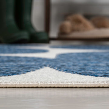 This rug's modern geometric pattern is inspired by organic shapes in Scandinavian design. It's made from durable synthetic fibers woven into a bold pattern. Use this stylish rug outdoors, or in the bedroom, living room or dining room.