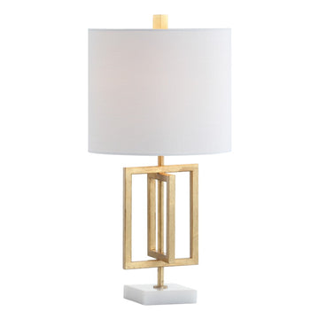 We love the geometric structure of this brass body paired with the marble-like base--a pairing that feels contemporary and luxurious. Featuring a silk wrapped cord and a brass finial, this piece is stylish from head to toe. At 20" high, this lamp is perfectly scaled to sit atop a desk, armoire, or side table.