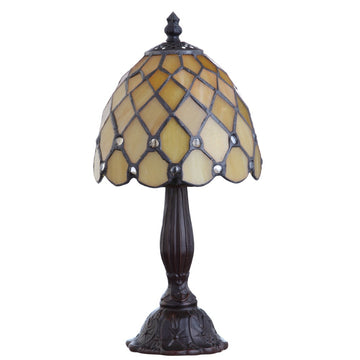 Add a touch of classic elegance to the tables in your living room with this lovely Tiffany-inspired table lamp. Warm shades of ivory imbued into each glass piece provide soft ambient light, punctuated with clear jewels, which cast a beautiful pattern on the surrounding walls. While inspired by traditional design, this piece is updated with the functionality expected today -- an on/off switch at the top of the silk-wrapped cord and LED bulb compatibility.