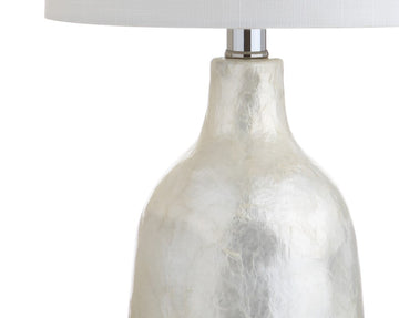 Delicately finished with capiz shells to create an iridescent pearl-style finish, this shapely lamp is an instant classic. Well suited to any style of home décor, whether on an end table or bedside this gorgeous piece will add a feminine glow to any corner. Finished in a white linen drum shade and silk-wrapped cord, this piece is destined to be an instant classic.