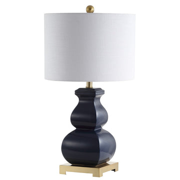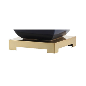 Footed vases have long been popular ways to display vases and objects, but are seldom seen in modern lighting -- until now. The glossy glazed ceramic base is perched perfectly atop a golden metal stand, adding decorative interest without taking away from this table lamp's broad appeal and versatility. A hardback linen drum shade and gold finial top the look.