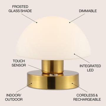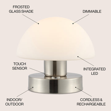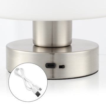 Add mid-century flair to your bar, console, or vanity with our 7.9" tall accent lamp. This cordless, rechargeable mini lamp is the perfect minimalist accent for your dining room, living room, bedroom, or entry. The frosted glass mushroom globe has single LED bulb, for soft accent lighting with clean lines and a high-quality finish.