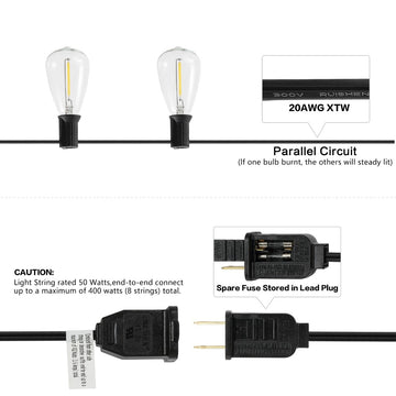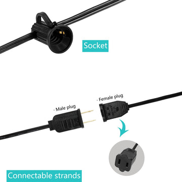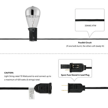 Add instant lighting to your patio, deck or balcony with our Outdoor Lights; 10 bulbs are spaced 12" apart along a 10' cord. Clear bulbs on a wire allow for bright direct lighting. Use with a dimmer for soft lighting at a wedding, party, or camping. Heavy duty sockets stand up to rain and wind. Leave them up all summer for entertaining outside, or keep them up all year in mild climates.