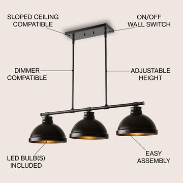 This simple linear pendant light is the perfect addition for your modern farmhouse, rustic kitchen, or industrial interior design. Three Edison-style LED bulbs provide warm light under metal-dome shades. The linear design is sized for a kitchen island but will also look just as great over a rustic dining table.