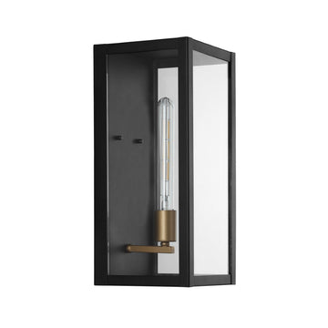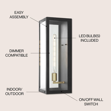 Our stylish black finish gives a minimalist edge to this modern, rectangular light fixture. The tall, Edison-style LED bulb and brass-toned fittings add industrial flair. This outdoor lantern's clean lines are ideal for a mid-century modern or contemporary front entry, walkway or patio.