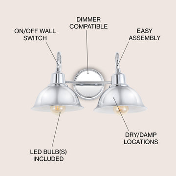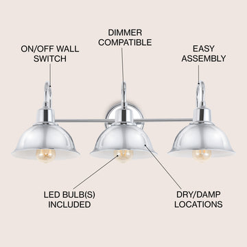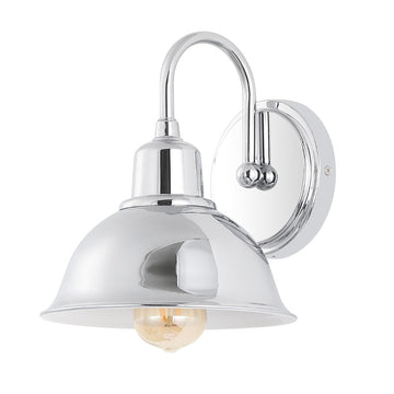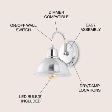 The traditional lines of this wall light give it a pared-down classic look. A sparkling chrome finish and metal shade adds low-key vintage style over a bathroom mirror or kitchen sink. The bright LED bulb provides plenty of soft light to warm up your space.