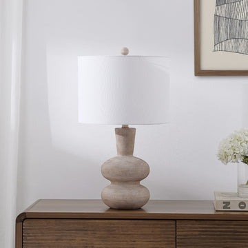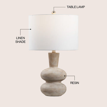Modern and minimalist, this sculptural lamp adds texture and interest to any space. Made from durable resin, it's finished with an oak wood grain and topped with a hardback linen shade. The LED bulb brings warm, bright light to the living room, bedroom or office.