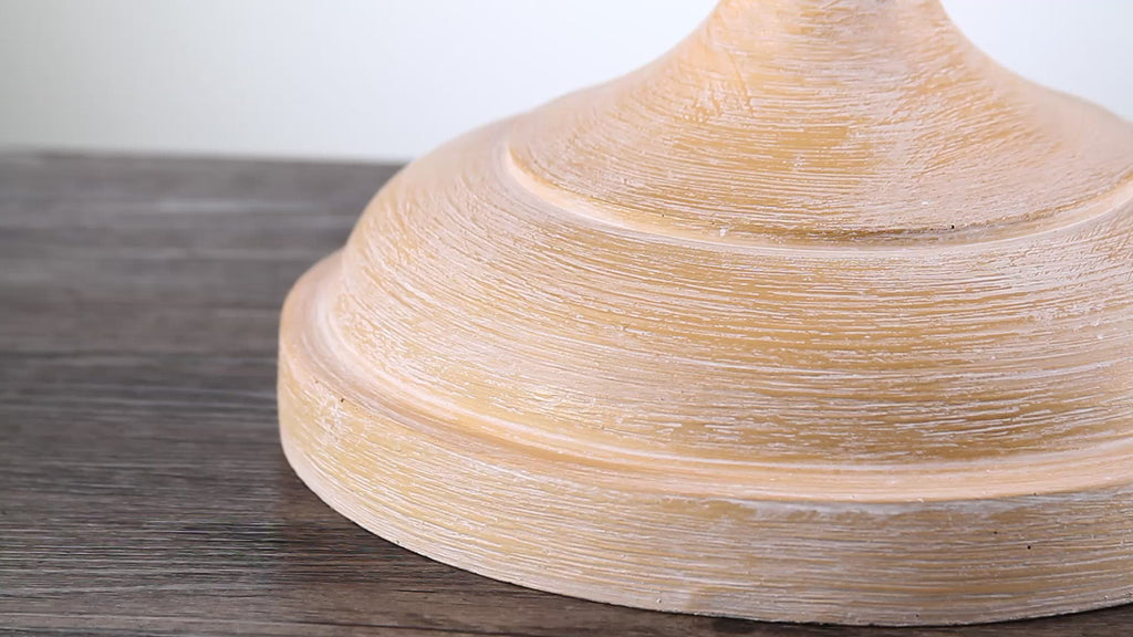 Casted in resin for extra durability, but with the natural appearance of wood, this shapely lamp base adds flair to any vignette. Simulating the classic spindles and turned wood techniques of skilled artisans, the curved base is topped with a classic linen drum shade. This floor lamp operates via a foot-step switch on the silk-wrapped cord.